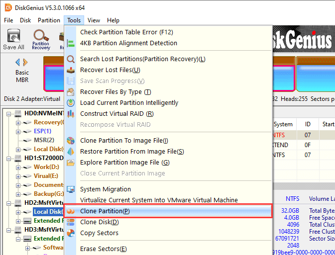 Step 1. Install and open DiskGenius Free Edition. Click Tools > Clone Partition.
